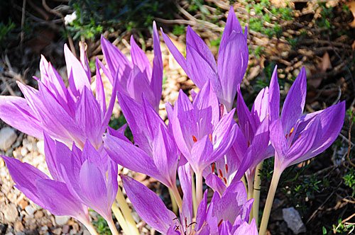 Colchicum autumnale is the most well known and widely cultivated of the autumn crocuses. In the fall of the year autumn crocus sends up white, pink, lavender or purple flowers which are shaped like champagne glasses 5-7 in tall and 2-3 in across.