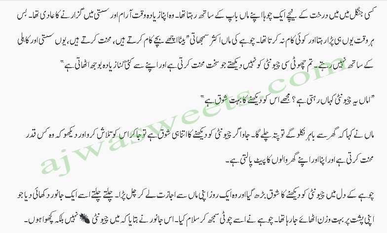 تم چھوٹی سی چیونٹی کو نہیں دیکھتے جو سخت محنت کرتی ہے۔ اور اپنے سے کئی گنازیادہ بوجھ اٹھاتی ہے۔” ”اماں یہ چیونٹی کہاں رہتی ہے ؟ مجھے اس کو دیکھنے کا بہت شوق ہے۔” ماں نے کہا کہ گھر سے باہر نکلو گے تو پتہ چلے گا۔ جاؤ اگر چیونٹی کو دیکھنے کا اتنا ہی شوق ہے۔ تو جا کر اس کو تلاش کرو اور دیکھو کہ وہ کس قدر محنت کرتی ہے۔ اور اپنا اور اپنے گھر والوں کا پیٹ پالتی ہے۔