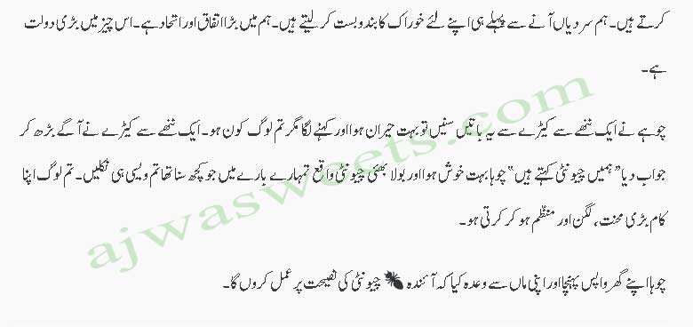 ان میں سے ایک کیڑا بولا۔ میاں چو ہے ذرا ایک طرف ہو کر بیٹھ جاؤ۔ ہم کھانا اپنے گھر لے جارہے ہیں۔ چوہے نے حیران ہو کر کہا انتا بڑا دانہ تم کیسے اٹھا کر لے جارہے ہو۔ کیڑے نے جواب دیا ہم چھوٹے ضرور ہیں۔ مگر اپنا ہر کام ہمت اور حوصلے سے کرتے ہیں۔ اور مل جل کر کرتے ہیں۔ ہم سردیاں آنے سے پہلے ہی اپنے لئے خوراک کا بندوبست کر لیتے ہیں۔ ہم میں بڑا اتفاق اور اتحاد ہے۔ اس چیز میں بڑی دولت ہے۔