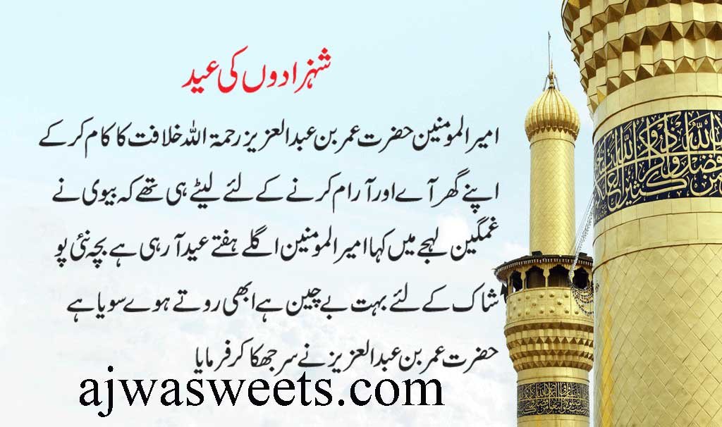 امیر المومنین حضرت عمر بن عبدالعزیز رحمۃ اللہ خلافت کا کام کر کے اپنے گھر آئے۔ اور آرام کرنے کے لئے لیٹے ہی تھے۔ کہ بیوی نے غمگین لیجے میں کہا۔ امیر المومنین اگلے ہفتے عید آ رہی ہے۔ بچہ نئی پو شاک کے لئے بہت بے چین ہے۔ ابھی روتے ہوے سوئے ہیں۔ حضرت عمر بن عبدالعزیز نے سر جھکا کرفرمایا تمھیں تو معلوم ہے کہ مجھے تو صرف سو درہم ماہوار ملتے ہیں۔ جس میں گھر کا خرچہ بڑی مشکل سے پورا ہوتا ہے۔ ،، بیوی وہ تو میں بھی جانتی ہوں۔ آپ بیت المال سے قرض لے لیں حضرت عمر بن عبدالعزیز نے فرمایا بیت المال تو صرف غریبوں یتیموں فقیروں کا حق ہے۔ میں تو صرف اس کا امین ہوں۔ بیوی بولی بے شک میرے سرتاج آپ کی بات سچ ہے۔ مگر بچہ تو ناسمجھ ہے۔ اس کے آنسو نہیں دیکھے جاتے۔