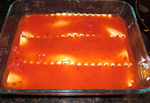 Put lasagna noodles in a baking dish side by side in a single layer.