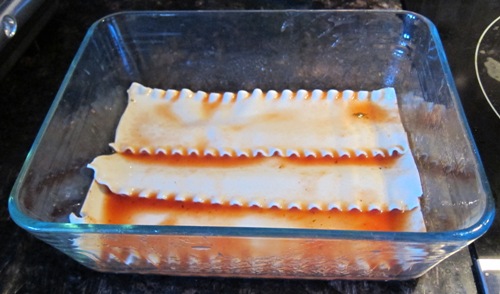 Before assembling lasagna, you have to make lasagna noodles soft. You can do it by either boiling lasagna noodles according to directions printed on their package, or you can soak them in hot water. I prefer the soaking method since it’s much easier. Just put the lasagna noodles in the baking dish, and fill with hot tap water. In 15 minutes, lasagna noodles will be soft without boiling.