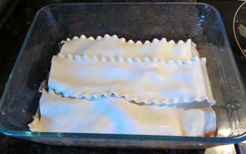 Put lasagna noodles side-by-side in a single layer on top of the meat sauce