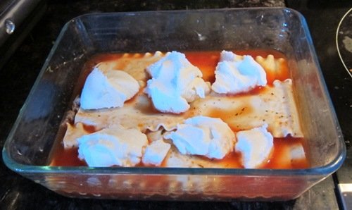Here’s a picture of when the ricotta was first put on the lasagna (before spreading it even).